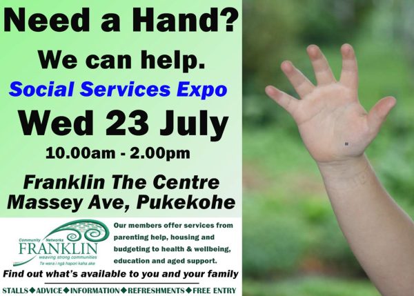 Social Services Expo, Wednesday 23 July, 10am-2pm, upstairs above the library at Franklin the Centre, Massey Ave, Pukekohe.